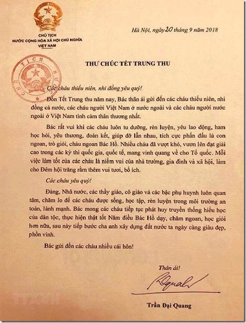 Tôi hay đọc “Thư chúc Tết Trung thu” của các ông Chủ tịch nước, mặc dù các cháu còn nhỏ chưa chắc đã quan tâm và hiểu các ông lớn nói gì (các cháu chỉ thích ăn và chơi vui vẻ thôi). Ông Trần Đại Quang có 3 cái “Thư chúc Tết Trung thu” vào các năm 2016, 2017, 2018 (xem hình kèm theo). So sánh 3 cái thư, có mấy nhận xét nhỏ: